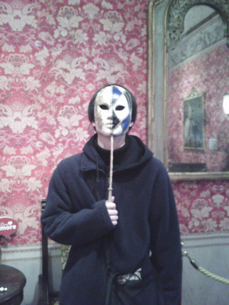 これはヴェネチアの仮面で厳格な身分社会だった当時、仮面をつけることで貴族,平民が素性を隠して平等にお祭りを楽しんだそうです。私も身分を隠し館内の見学に行きました(笑)