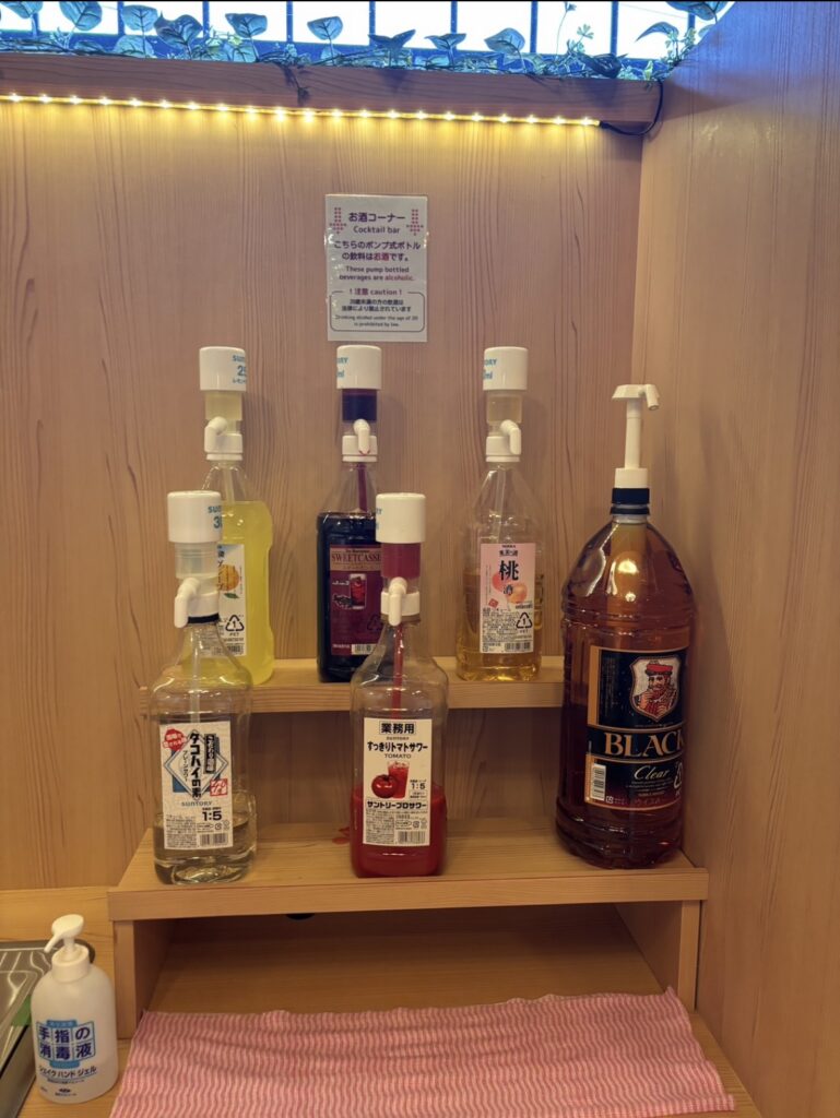 フロントにはお酒コーナーとドリンクバーがあり飲み放題なんです!